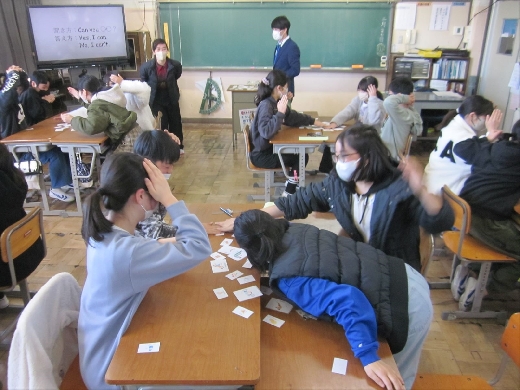授業では、自己紹介に関するクイズに挑戦したり、グループになってカードを使ったゲームをしたりしました。みなさん、意欲的に活動していましたね。中学校でも英語の授業頑張っていきましょう。