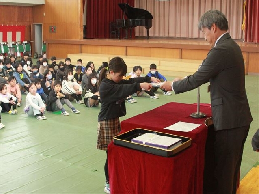 3月24日(月)は修了式でした。代表児童の作文発表では、今年度を振り返り自分ができるようになったことを力強く発表しました。また、校長からは各学級の代表に修了証を手渡しました。校長式辞では1年間の児童の活躍を称えるとともに新年度に向けてそれぞれが目標をもつことを話しました。事故などなく新年度を迎えられるようご協力をよろしくお願いいたします。