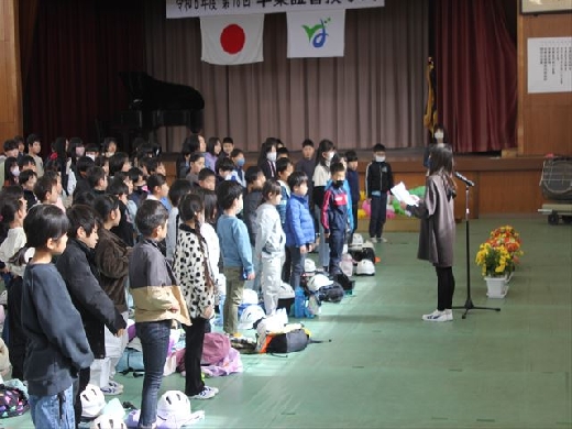 3月31日(月)は、先生とのお別れ式を行いました。今年度末は5名の教職員が人事異動となりました。式では児童代表からあたたかいお別れの言葉や花束贈呈がありました。また異動する職員からも感謝の言葉がありました。保護者・地域の皆様にも大変お世話になりました。ありがとうございました。