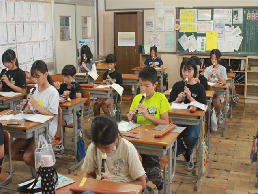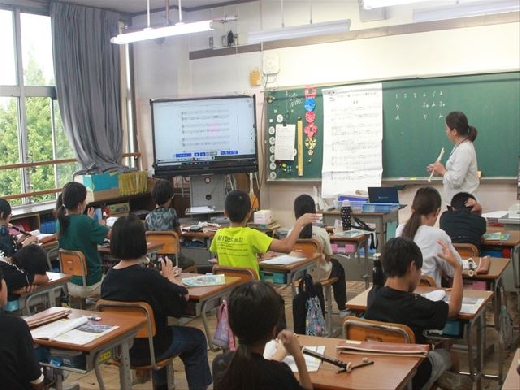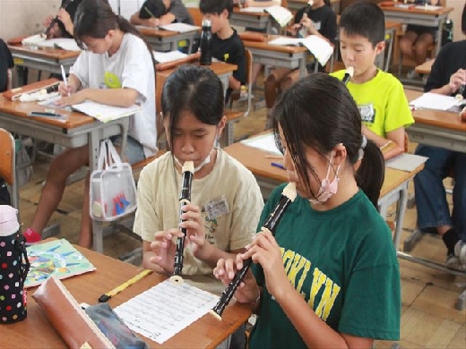リコーダーの学習です。「かけ合いや重なりを生かして演奏する」ことを目的にしています。題材は「星笛」で八分の六拍子という難しいリズムの曲ですが、友人と教えあいながら、主旋律も対旋律も上手に演奏していました。