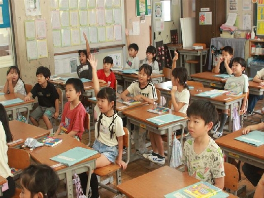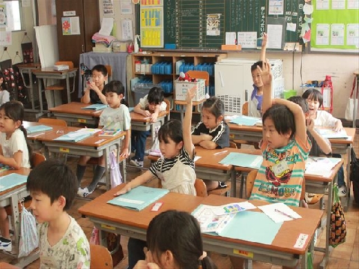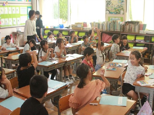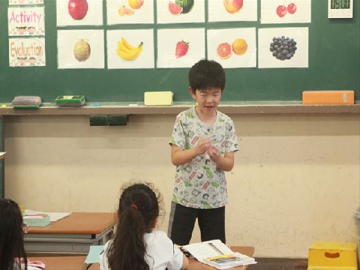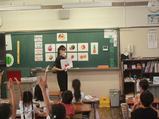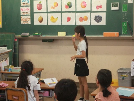 果物の名前あてゲームをしました。写真を提示された児童たちは、積極的に英語でその名前を答えていました。また、ジェスチャーゲームで何の果物かを当てるゲームもしました。楽しく、元気に学習に取り組むことができました。