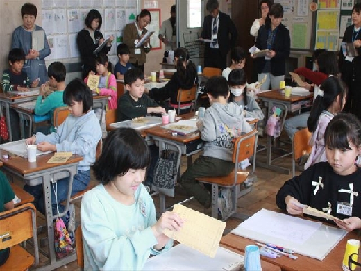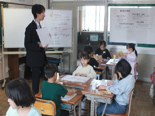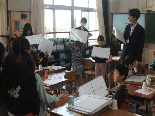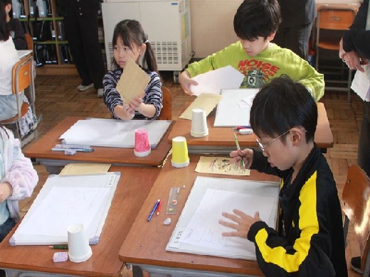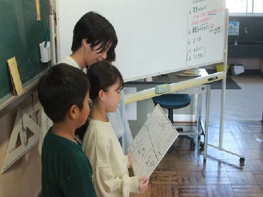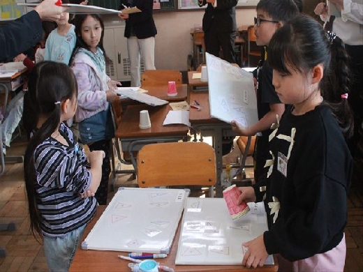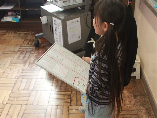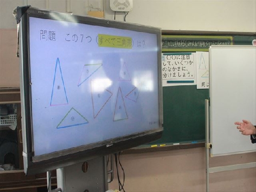 「7つの三角形を仲間分けするには、何に注目すればよいのだろうか」を考えました。大きさや形、角の大きさや辺の長さなど、注目するポイントを自分で選択し、それぞれに仲間分けを行いました。大きさや形などをポイントに考えていたグループは、条件に合わないものが出てきたり、グループによって判断が変わったりと、うまくいかないことに気付きます。しかし、試行錯誤を繰り返し、辺の長さに注目することで、きちんと仲間分けができることを見出していました。
