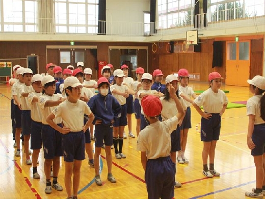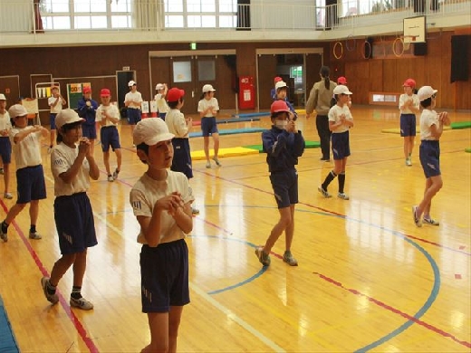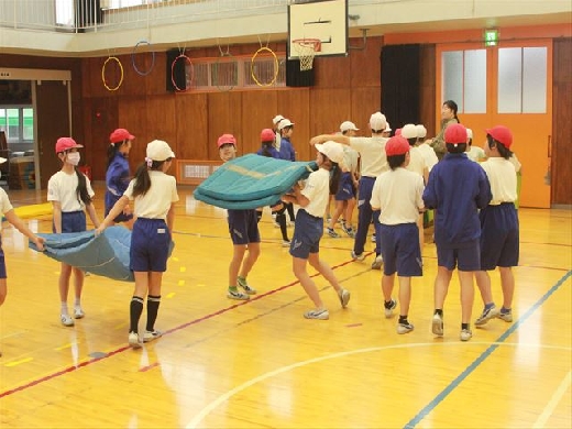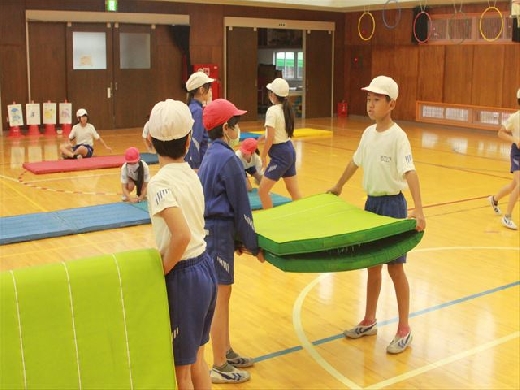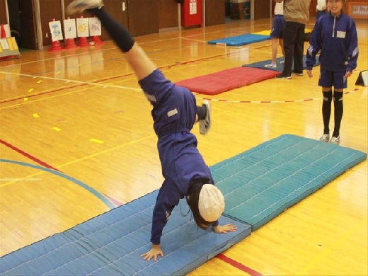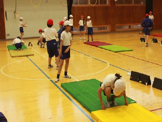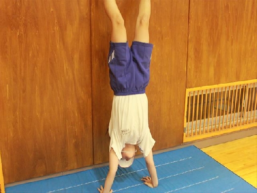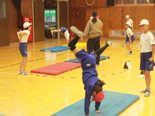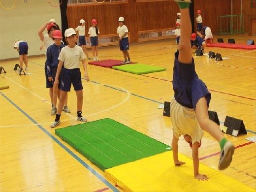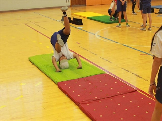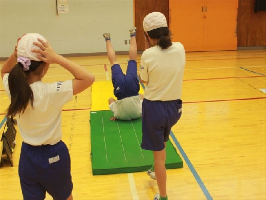 マット運動の学習です。グループごとにICTを活用して動画を撮影しながら技の精度を上げていました。前転や後転、開脚前転や側転の他、壁倒立にも挑戦していました。皆が安全に気を付けながら協力して学習に取り組みました。