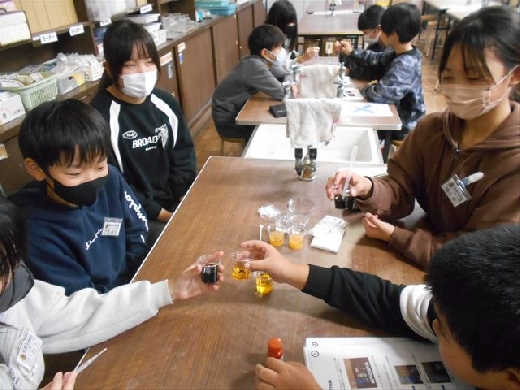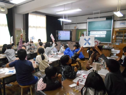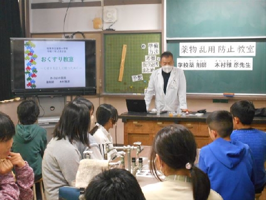 12月2日(火)は、学校薬剤師の先生を講師として、第5学年で薬物乱用防止教室を実施しました。クイズ形式による服薬の際の注意点の学習や、薬はなぜ水やぬるま湯で飲むのがよいのかを実験を通して学びました。また、違法薬物の影響についても学習しました。「親にタバコをやめさせるにはどうすればよいのか?」「麦茶で薬を飲むのはどうなのか?」など、さらに学習を深めようという質問が多く出ました。とても有意義な学習となりました。