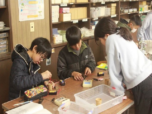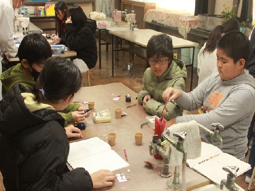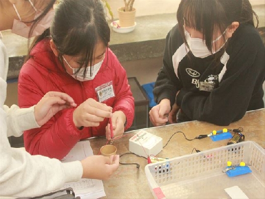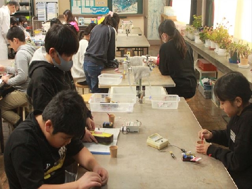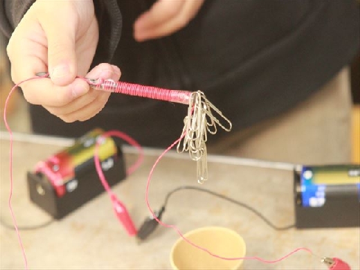 「電磁石の強さを強くするにはどのようにすればよいのだろうか」を課題として学習しました。はじめに予想を立て「電流を強くする」「コイルの巻き数を多くする」等の意見を出しました。今回は乾電池の数を変えて、電流の大きさとの関係を実験で確かめました。電流を増やすと電磁石の力が増すことを見出しました。