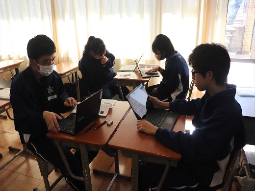 プログラミングの学習を行っています。サンプルプログラムをもとに課題に取り組み、わからないところは友人と協力し合って考えました。すべての課題を達成した生徒は、発展課題としてアニメーションを作成しています。