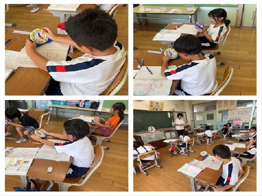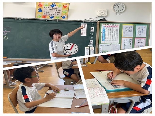 1年生の算数では、時計の読み方・時刻の表し方の学習に入りました。今日は、教室の壁時計や学習用の大きな時計で「何時?」の読み方を学習。右回りにみんなで大きく腕を回して、「時計回り」も体感しました。その後、算数セットの中から「時計」を出して実際に操作しながら学習を進めていました。頑張っていきましょう。