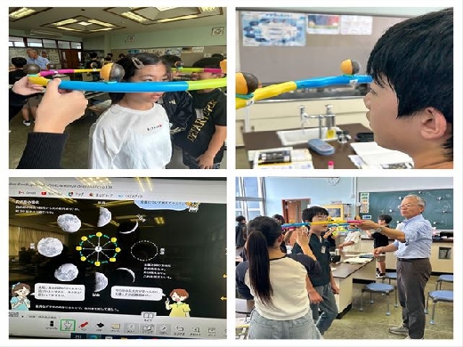 3年生「好きなものばかり食べていいの?」の授業を実施しました。栄養教諭から食べ物の働きとそれぞれの食材について学び、今日の給食にそれらがバランスよく入っていることを知りました。6年生の理科では、担当の先生自作教材による「月の見え方」を学習。自身の頭をフープの中に入れて反時計回りに回転(地球の自転)し、太陽の光源に照らされた部分と影の部分により、満月・新月など月の見え方が変わることを理解していました。