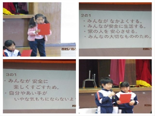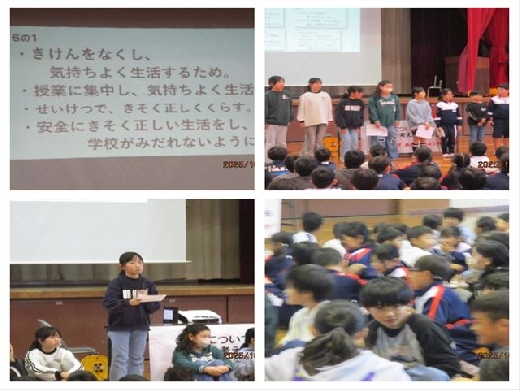 自分たちの学校をよりよくするために、計画委員会が主催して実施しました。本校には「長須小よいこの約束」というきまりがありますが、なぜそのようなきまりがあるのか、事前に各学級で考えたのちに、集会に臨みました。学級代表者からの発表に続き、発表を聞いて改めて考えたことの振り返り発表がありました。物事を自分や社会に照らしながら主体的に考え、自他のよりよい成長につながる「考動」がとれる児童の育成に努めていきたいと思います。