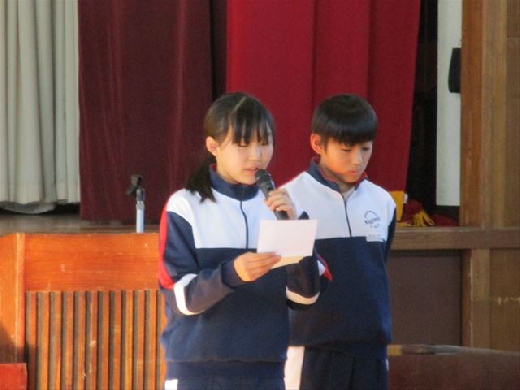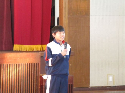 7日(日)に福島県南相馬市で行われる「野馬追の里健康マラソン大会」に坂東市から出場する選手団。本校からは、6年生の2名が代表して出場します。本日、壮行会を実施しました。代表者からの「頑張ってきます!」という決意表明に続き、児童からの力強いエールが送られました。ベストを尽くして走りぬいてください!
