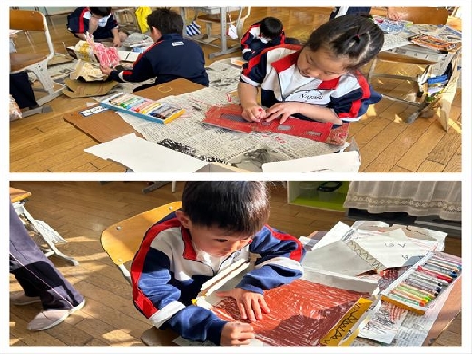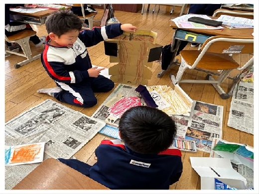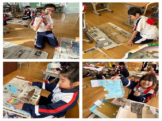 5時間目、1年生が図工の学習をしていました。いろいろな箱を開いて、その形から動植物や物を見立てて作品にしていました。象やちょうちょ、恐竜や犬などが子供の柔らかな発想で次々に誕生していました。