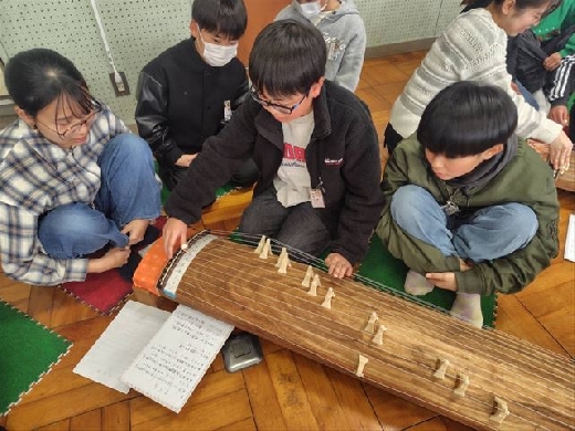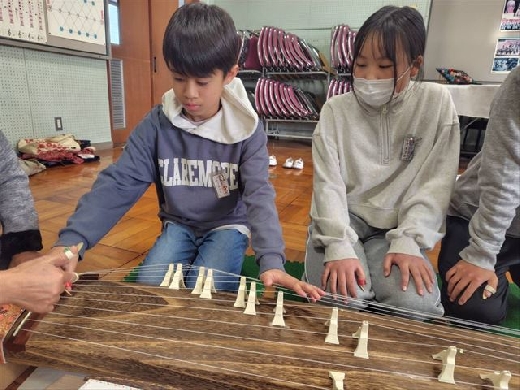 長須地区にお住いの琴の演奏家の方や門下の方々をお招きし、6年生が「琴」の体験をしました。琴を六面ご用意いただいたおかげで、児童は一人一人じっくりと琴にふれて「さくら」の練習に取り組むこともできました。また、「六段の調」も演奏くださり、筝曲の美しい響きや我が国の伝統音楽を直に鑑賞することができました。大変お世話になりました。