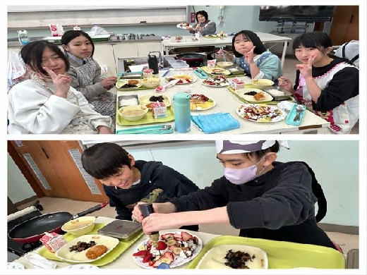 卒業を前に、6年生がお楽しみ調理実習を行いました。クリームやチョコ、フルーツをたくさん乗せたパンケーキのデザートです。直前までやっていた卒業式練習時の真剣な表情とはうって変わり、ニコニコ笑顔がいっぱいでした。職員にもおすそ分けをいただき、とても美味しかったです。ご馳走様でした!