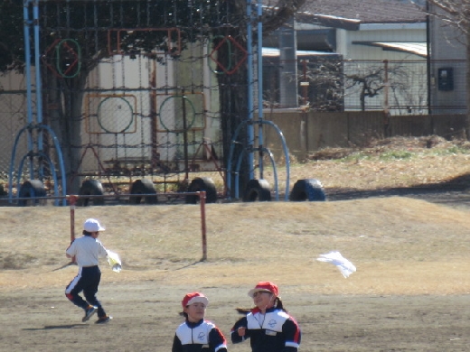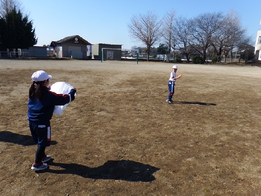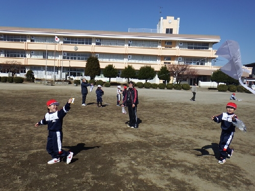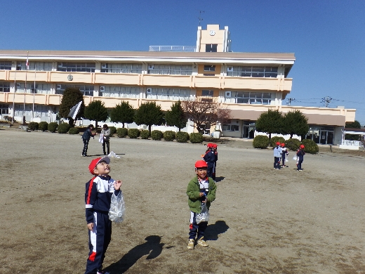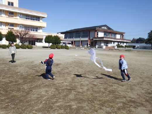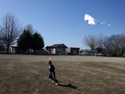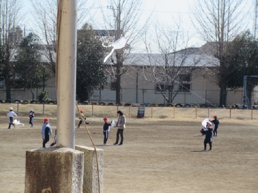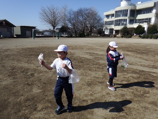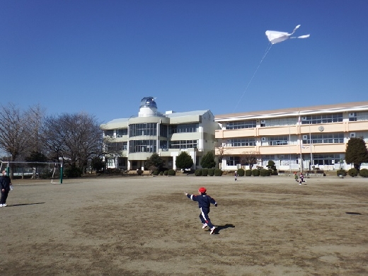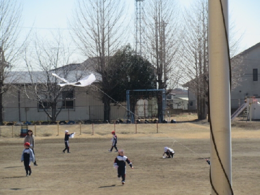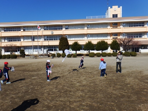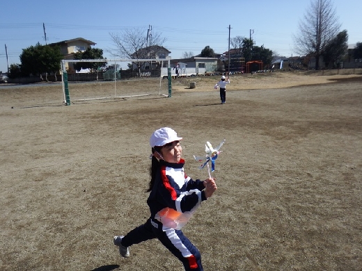 今日は、1年生が生活科「かぜとあそぼう」の学習で、校庭で紙ひこうきやたこあげ、風車などをしていました。