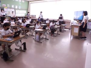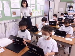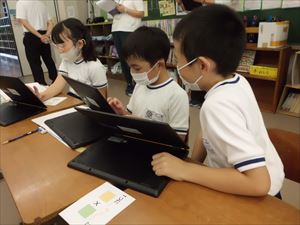 1人1台端末を活用して、画像からかけ算の式を考え、ペアで話し合い、考えを深めている様子が見られました。