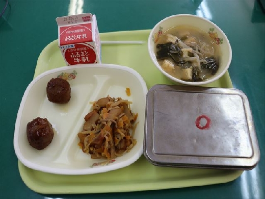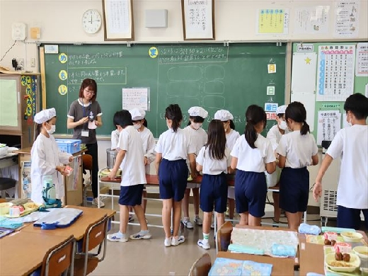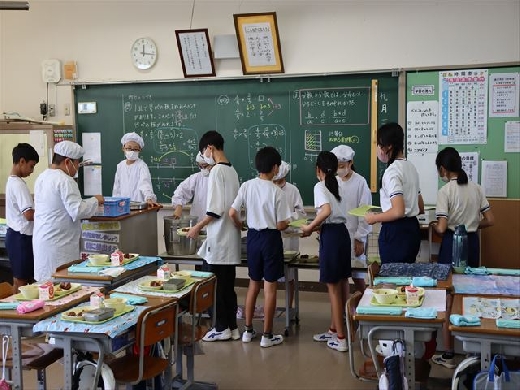 給食の準備の様子です。 給食当番の児童がしっかりと服装を整え、それ以外の児童は整然と並んで準備をすることができていました。 素晴らしい配膳の様子でした。