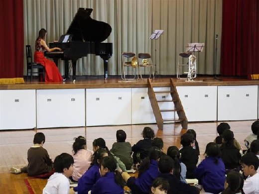 演奏していただいた楽器はホルン、ユーフォニアム、ピアノです。それぞれの楽器の特徴についてもクイズなどを交えながら教えていただきました。