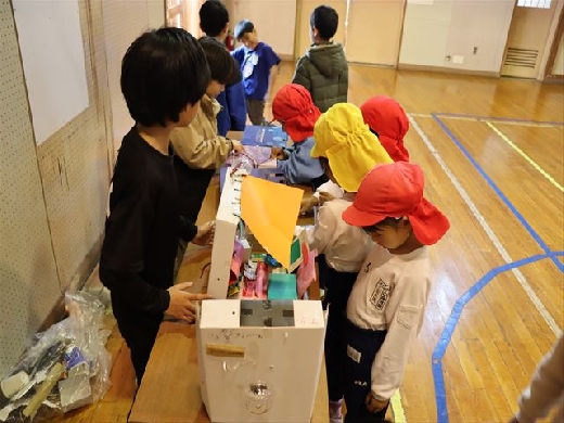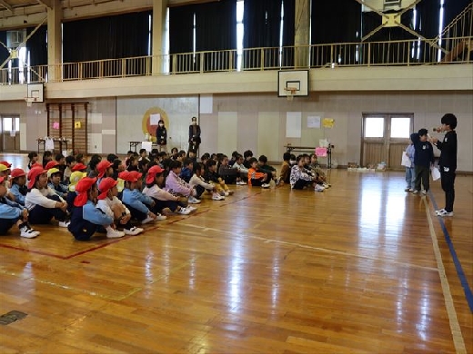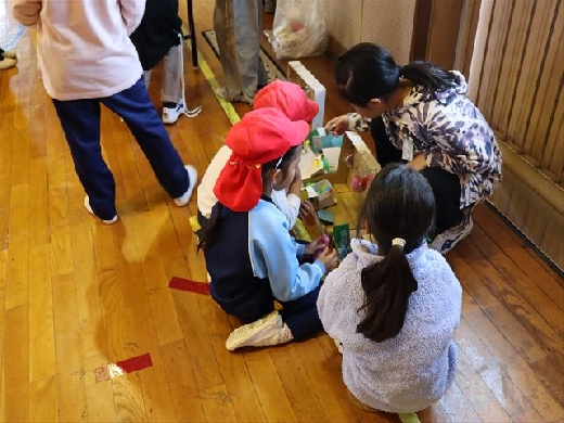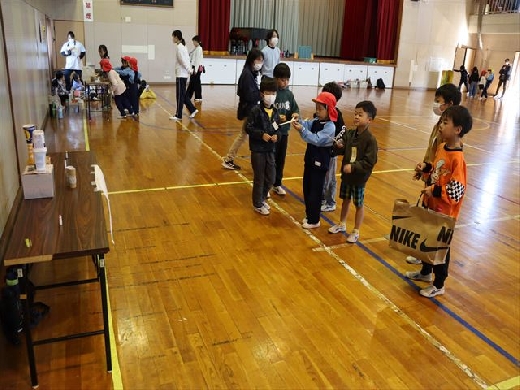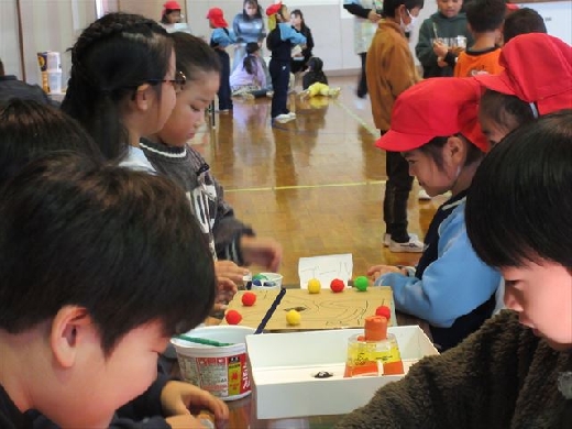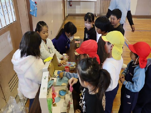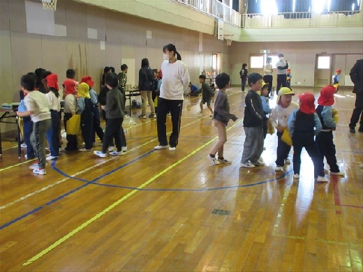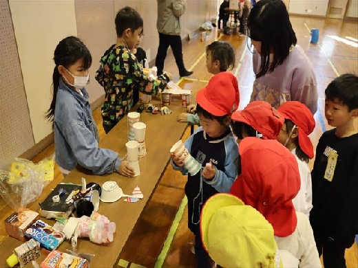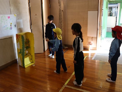 生活科の時間に1、2年生が小山保育園の年長組の皆さんを招待し、体育館で秋まつりを行いました。 2年生が中心となって実施しました。たくさんの笑顔があふれる楽しい時間になりました。