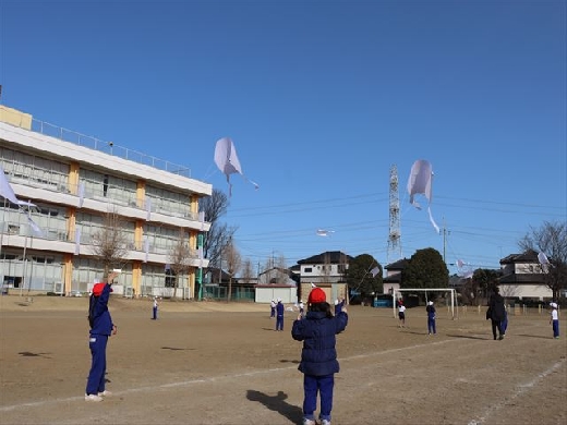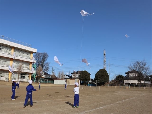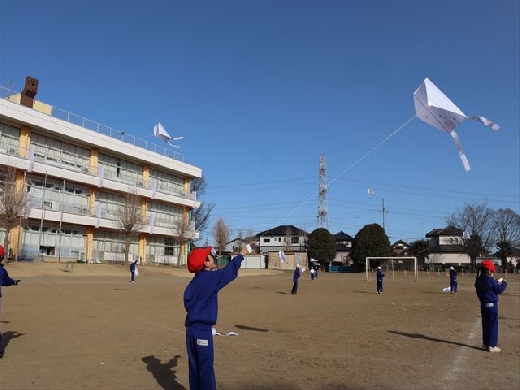 1年生が、生活科の時間に、凧あげを行いました。 とても高く上がった凧を見て、歓声をあげる1年生の姿がとても印象的でした。楽しく凧あげ体験をすることができました。