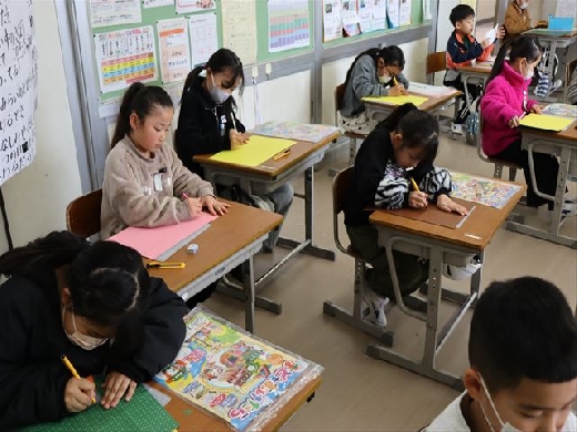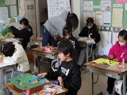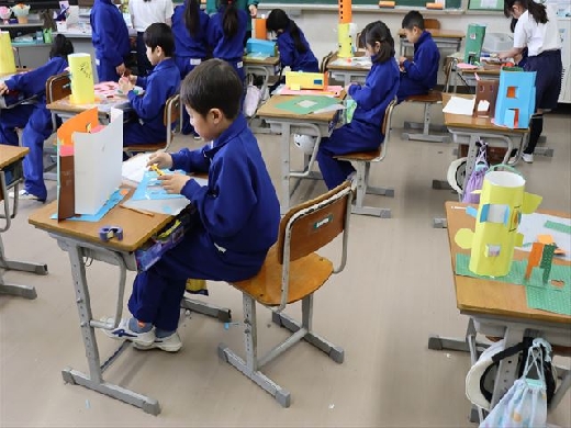 色画用紙をカッターで切り出し、様々な窓がある建物をつくりました。初めてカッターを使用するため、PTAスクールボランティアとして保護者の皆様が活動をサポートしてくださいました。