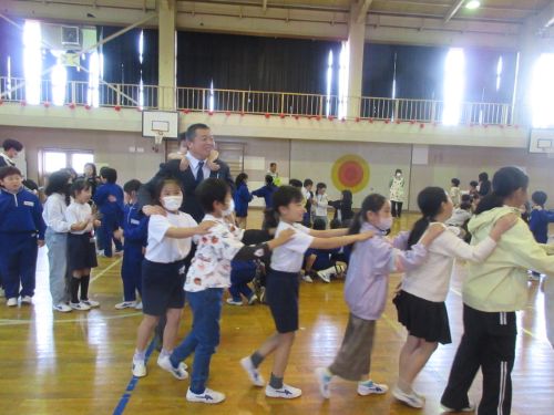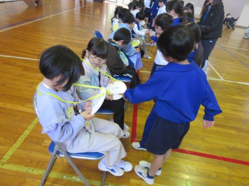 校長先生におんぶしてもらいながら、じゃんけん列車を進む1生のうれしそうな様子に、周りの子供たちも笑顔です。