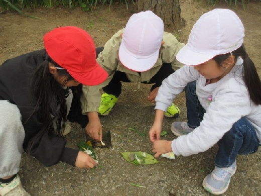 また、木陰では集めた葉っぱや花を使って、楽しそうにお店屋さんごっこ(?)をするグループも。