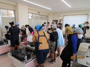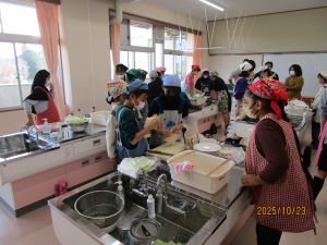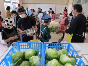 5年生が自分たちで育てたレタスを使って調理実習を行いました。レタスづくりに協力していただいたJAの方々も参加していただき、出来上がった料理をおいしくいただきました。