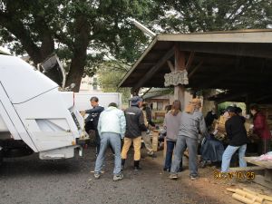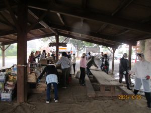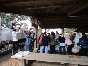 10月14日から24日の間に七重地区の皆さんから七重小ふれあい広場に持ってきたいただいた資源物がたくさん集まりました。25日早朝、雨の中、PTA役員と厚生委員の方々により、業者トラックへ積み込み作業を行いました。資源物回収にご協力いただいた方々、ありがとうございました。