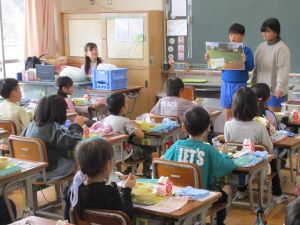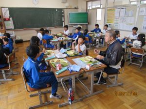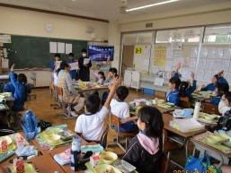 5年生が七重食育研究会・JA岩井の皆さんと育てたレタスが給食に出ました。レタスとたまごのスープとなってBブロックの献立となりました。給食の時間には5年生が各学級へ出向き、クイズを通して、レタスづくりの紹介をしました。