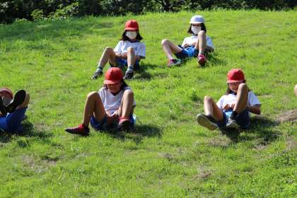 最後は芝すべりと川遊びを行いました。芝すべりではおしりと背中を真っ黒にしながら、時間いっぱい楽しみました。子ども達の溢れんばかりの笑顔が見られた時間でした。お家の方々には洗濯でお手数をおかけしたことと思います。ありがとうございました。