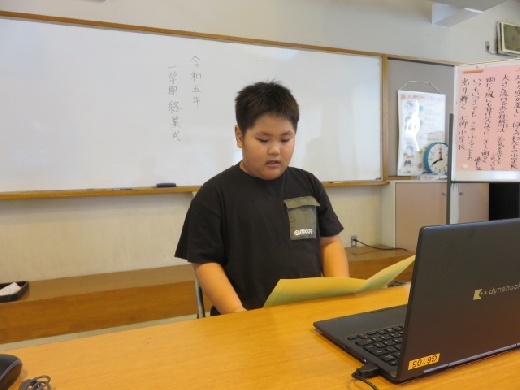 今日は第1学期終業式がオンラインで開催されました。先ずはあいさつマスターの表彰が行われました。発表されるとクラスのみんなから拍手があがりました。オンラインでしたが、6年生の伴奏で、みんなで校歌を歌いました。代表の作文では、3年生と4年生が1学期を振り返りがんばったことや2学期頑張りたいことを堂々と発表してくれました。