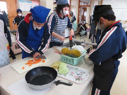 手際よく野菜を切ったり、フライパンで炒めたり、用具を洗ったり。チームワークの良さがうかがえました。