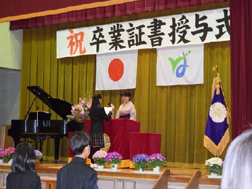 今日は、第77回卒業証書授与式が挙行されました。在校生全員が式に参列し、32名の卒業生を見送ることができました。卒業生の皆さんは市議会議員、教育委員をはじめ来賓の皆様、保護者の皆様に見守られながら堂々とした態度で校長先生から卒業証書を授与され、一人ひとり決意表明をしました。在校生からは心温まる呼びかけがあり、それに応えるように卒業生からのメッセージと「大切なもの」の合唱がありました。とても感動的な卒業式になりました。卒業生の皆さん、ご卒業おめでとうございます。これからの活躍を期待しています。
