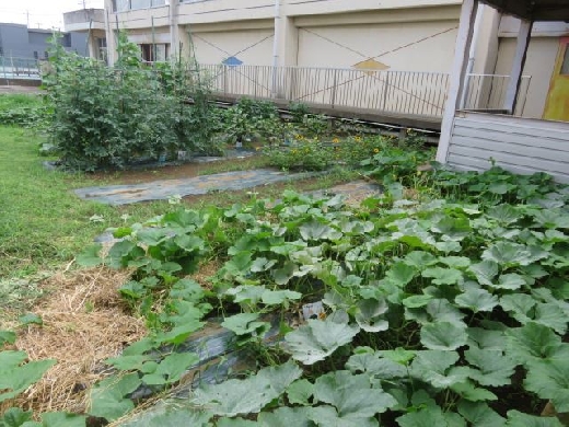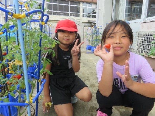 2年生が生活科で育てているナスやキュウリ、ピーマン、ミニトマトなどが収穫期を迎えました。