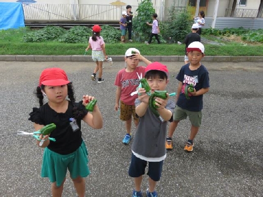 お世話した甲斐があって、大豊作のようです。「ピーマンは肉詰めにして食べたい!」「トマト持って帰ってサラダにするんだ。」と話し合いながら、収穫を楽しんでいました。