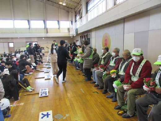 七郷子どもサポート隊に感謝の気持ちを伝える会を、隊員の皆様をお迎えして、体育館で行いました。