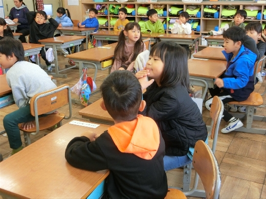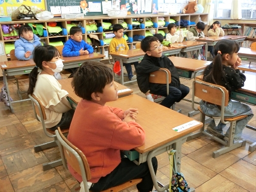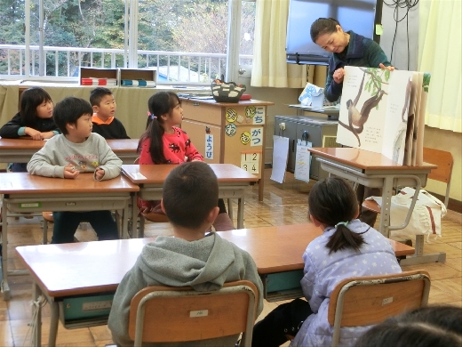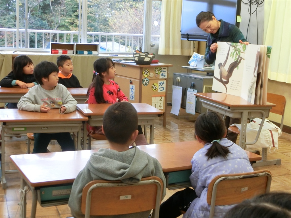 ぶんぶんクラブの方による読み聞かせがありました。本の題名は、川田 健作「しっぽのはたらき」です。いろいろな動物のしっぽのはたらきを絵と文で説明する絵本です。「バランスをとる」「物をつかむ」などのはたらきがあることを知って子供たちは、興味深く聞いていました。読み聞かせをしていただき、ありがとうございました。