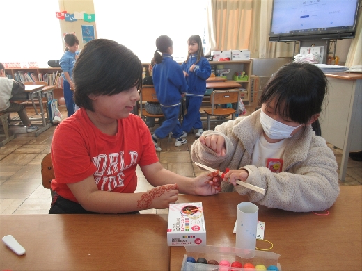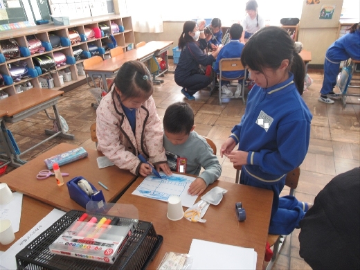 2年生が生活科でおもちゃづくりをしています。この日は、1年生におもちゃづくりを教えてあげる授業がありました。2年生は、1年生に分かりやすく、やさしく、ていねいにおもちゃの作り方を教えていました。