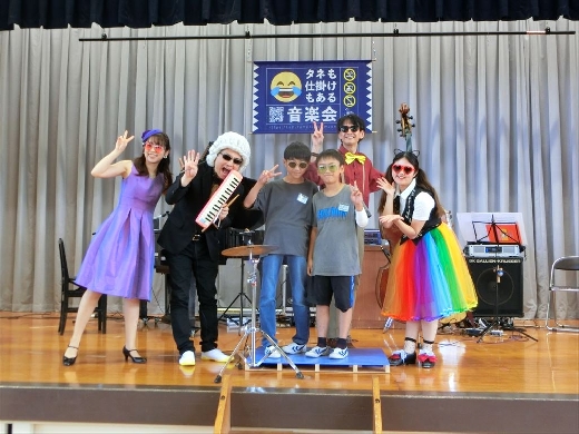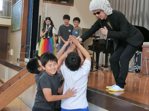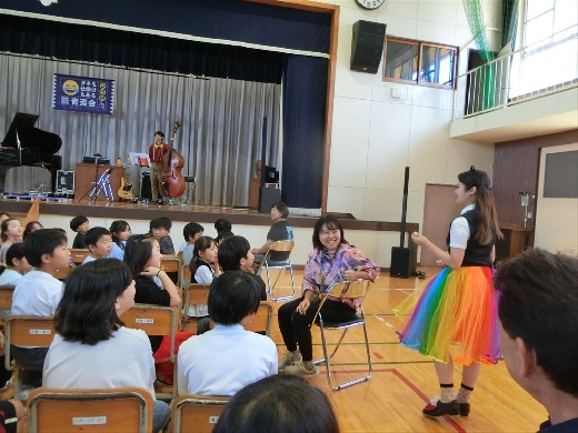 ピアノ、鍵盤ハーモニカ、コントラバス、ベースなど、さまざまな楽器を使った演奏が披露され、児童たちは目を輝かせながら鑑賞しました。ステージに上がって間近で楽器を見たり、演奏に参加させてもらったりする場面もあり、会場は大盛り上がり。手をたたいたり、足踏みしたり、歓声を上げながら、音楽の楽しさを全身で感じていました。
