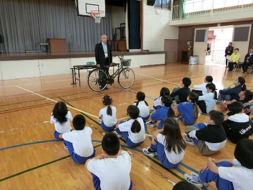 児童たちは、真剣な表情で話を聞き、安全に自転車に乗るためのルールをしっかりと学んでいました。