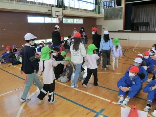 火災発生の合図とともに、本校児童は速やかに体育館へ避難しました。その後、園児たちも体育館に避難してきました。年中児と年長児を、5年生と6年生の児童がやさしく声をかけながら誘導し、落ち着いて避難できるようにサポートしました。園児の不安な気持ちに寄り添いながら、安心できるように行動することができました。
