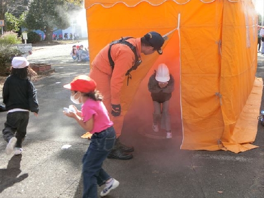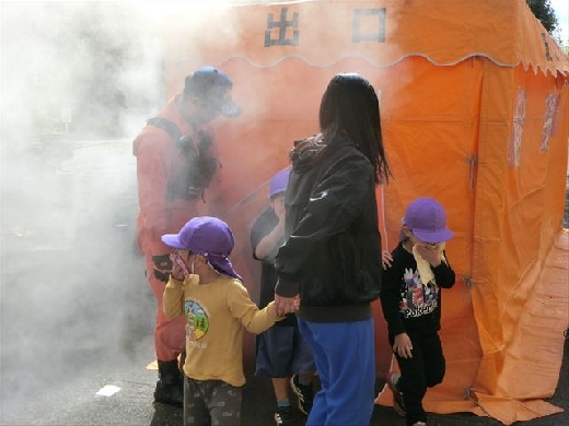 その後、園児と本校の1年生、3年生、5年生の児童が「煙体験」を行いました。煙の中を歩くことで、火災時の避難の大変さを実感することができました。