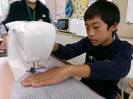 ミシンを使う前には、各部の名前や使い方を確認しました。初めてのミシン縫いに、児童たちは少し緊張した様子でしたが、先生の説明をよく聞きながら、ゆっくり丁寧に縫うことができました。