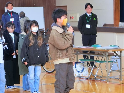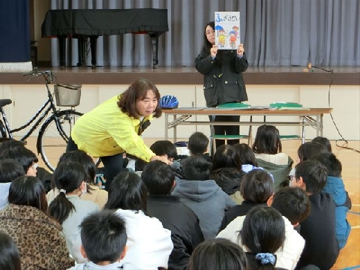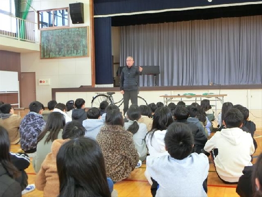 講師の方からは、自転車の点検方法や乗車時の基本的なルールについてお話があり、児童は真剣な表情で聞き、理解を深めていました。