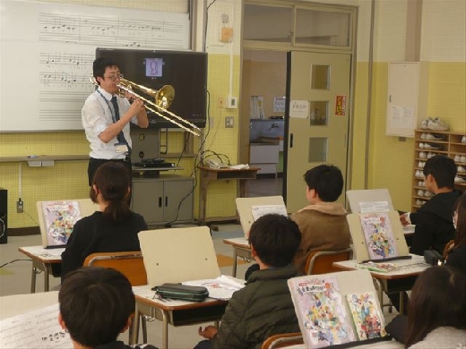 授業のはじめに、先生がトロンボーンの演奏を披露しました。