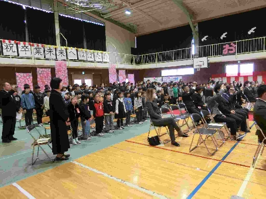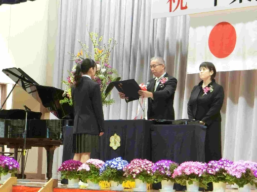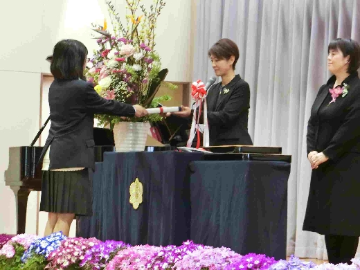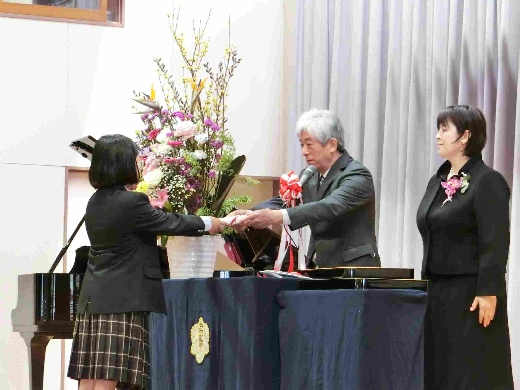 担任の先生の呼名に対し、卒業生は一人一人がはっきりと返事をし、校長先生から卒業証書を受け取りました。