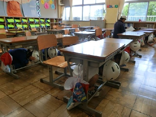 放送で、緊急地震アラートが流れ、避難の指示が出されると、子供たちは速やかに机の下に入り、頭を守る姿勢をとることができました。