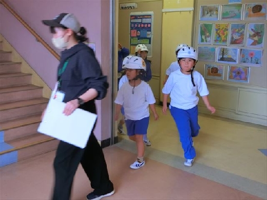 その後、避難開始の放送が出されると、約束事である「お(押さない)は(走らない)し(しゃべらない)も(もどらない)」を意識して、落ち着いて取り組む姿が見られました。