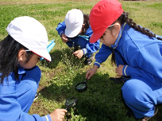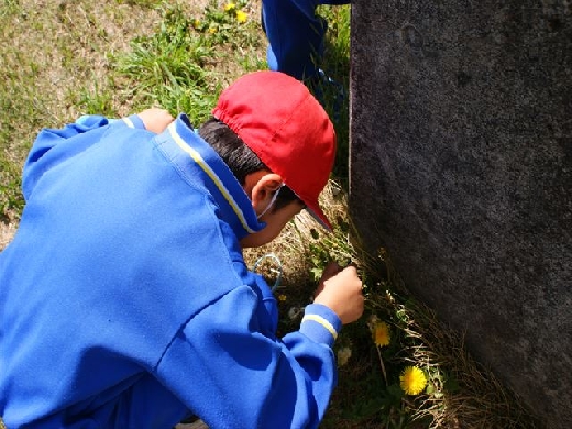 子供たちは、虫眼鏡をぎゅっと握りしめ、元気いっぱい校庭で春の生き物を探しました。