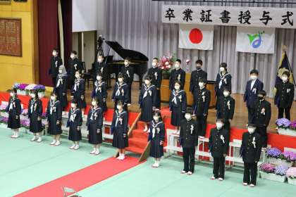 新型コロナウイルス感染拡大を防ぐため、全校児童が参加しての卒業式は行えませんでしたが、保護者と児童代表の5年生が参加し、6年生の最後の姿を見届けることができました。卒業証書を受け取る卒業生の表情からは、この式にのぞむ堂々とした姿と、中学生となってしっかりと勉強や生活、部活動等に励む意欲が感じられました。